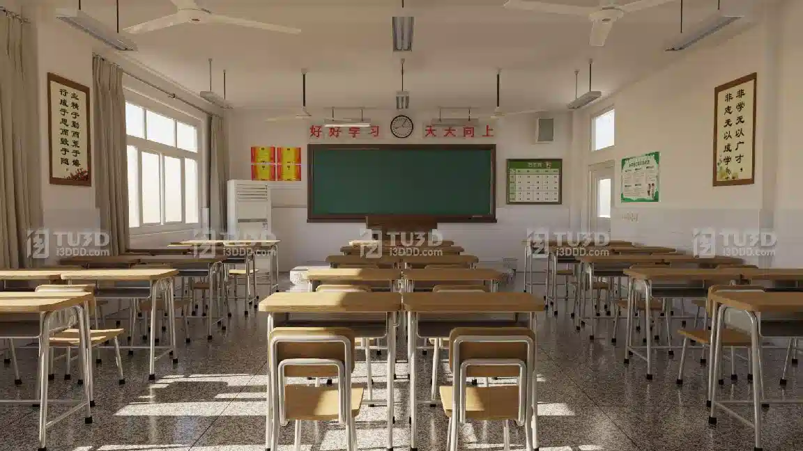 Blender学校教室讲台桌椅场景工程