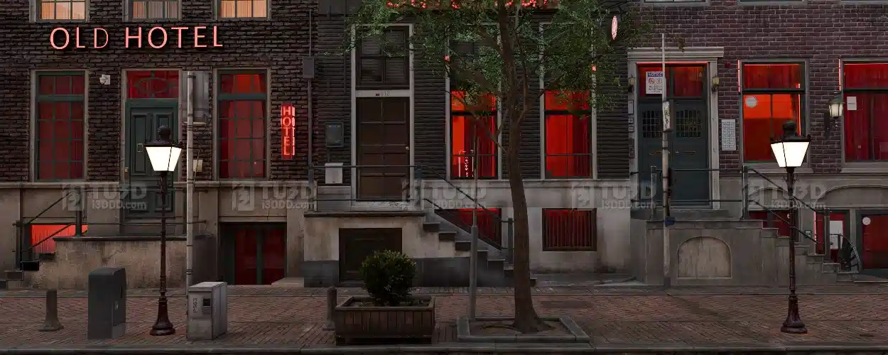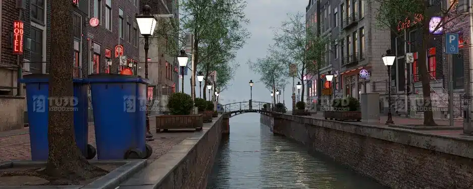 Blender 运河街道场景复古路灯与水城小镇夜景模型
