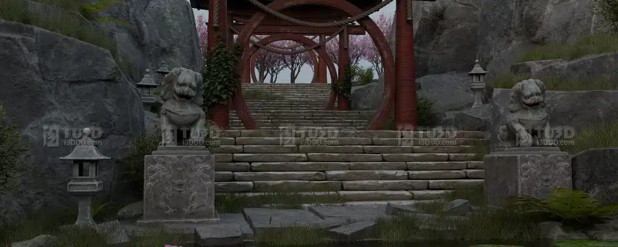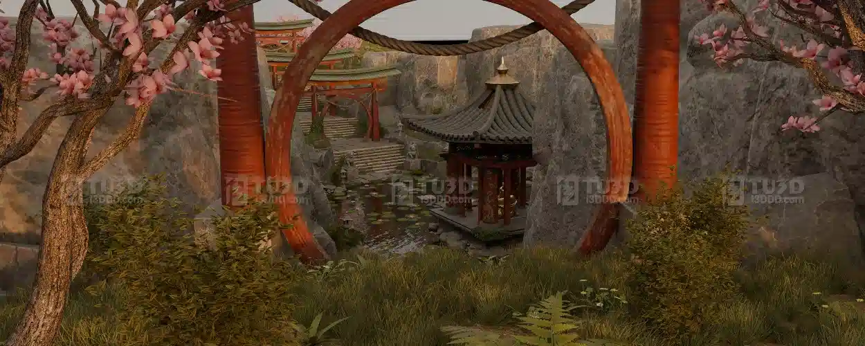 Blender 中式古风荷塘凉亭的东方禅意园林场景模型