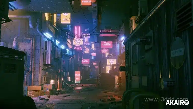 黑暗夜晚街道胡同小巷房屋霓虹灯牌场景 – Big Slum Alley
