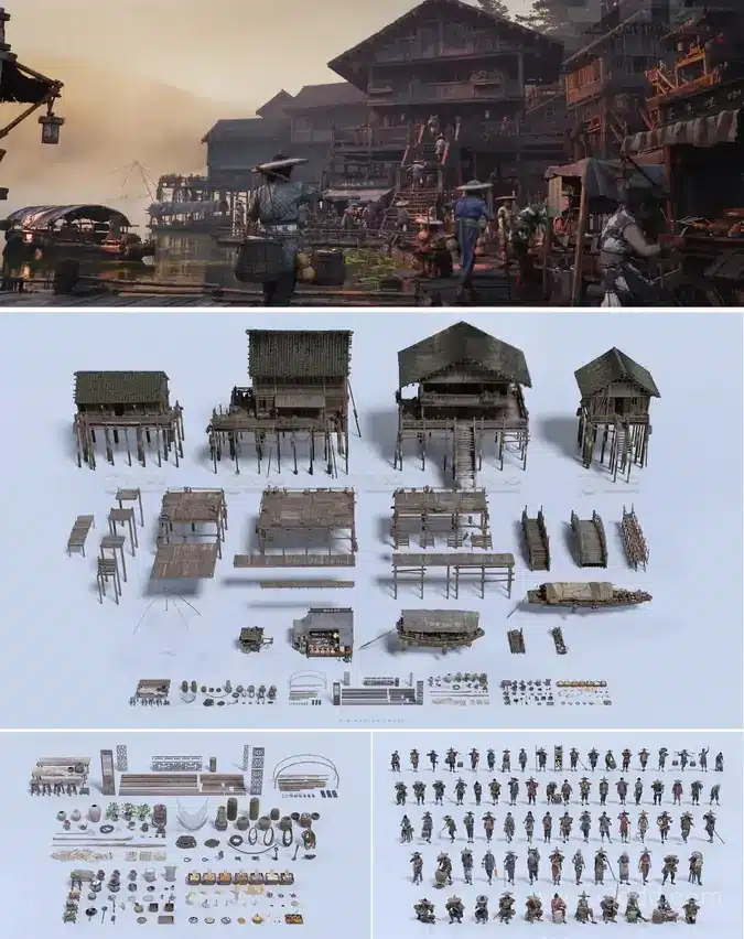 该套装包含 300 多个物品:4 个完全装配的模块化 CROWD 角色(提供 77 个预设姿势和颜色变化),4 个带有装饰元素的高度详细 HERO 建筑,日夜设置,2 个 Sampan 和 2 个筏组件,市场与食品车套装,200 多个套装敷料元素,搅拌机资产浏览器,UE5 蓝图,以及 UE5 定制水帘。所有资产均针对游戏引擎和主流 3D 软件包进行了优化,支持格式为 Blend 3.6+、OBJ、FBX、UE。