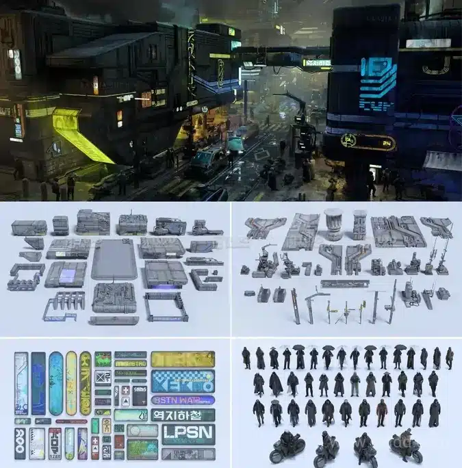 此捆绑包包括 200 多个项目:2 个高度详细的 HERO 建筑、37 个模块化套件 HERO 对象、2 个 MEGA 建筑结构、8 个背景建筑、24 个公路模块化资产、1 辆具 15 种不同配色方案的 HERO 汽车、1 个 MEGA 公路交叉口组件、3 个大型地面街道组件、24 个街道道具和迎宾用品、13 个路灯和灯杆、67 个霓虹灯和图形标志、12 辆背景车辆、43 个姿势人群角色,以及 Blender 资产浏览器。所有资产均针对游戏引擎和所有主要的 3D 软件包进行了优化,支持格式为 Blend 3.6+、OBJ、FBX、C4D、UE5.5+。